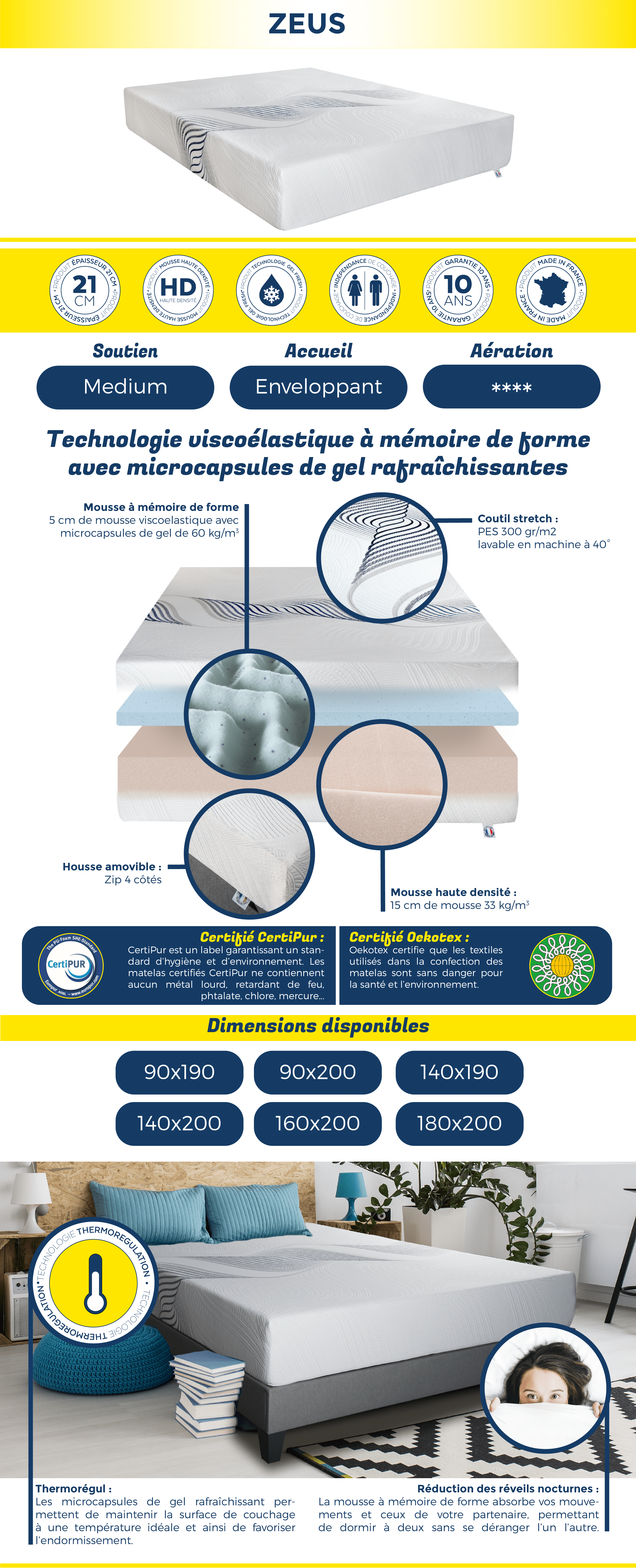 Ce matelas, est un matelas en mousse viscoélastique à mémoire de forme. C'est un matelas en mousse de 21 cm composé de 18 cm de mousse polyuréthane Haute Densité de 28 kg/m³ et de 3 cm de mousse viscoélastique à mémoire de forme Optima+ de 50 kg/m³.