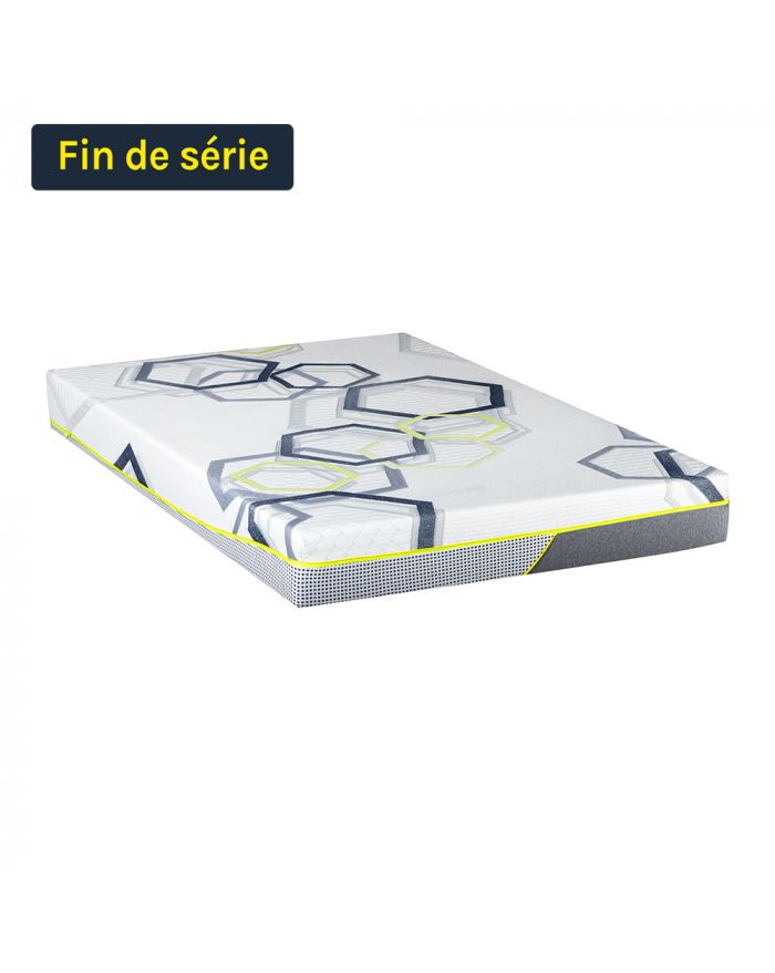 Ce matelas à mémoire de forme (Mousse viscoélastique) offre un soutien ferme et un accueil tonique pour un sommeil réparateur. Son indépendance de couchage est de qualité grâce à la mousse viscoélastique à mémoire de forme Optima+. Cette indépendance permet de ne pas sentir les mouvements de la personne avec qui vous partagez le lit. De plus, la mousse viscoélastique à mémoire de forme permet d'éviter les maux de dos en épousant le corps de l'utilisateur. Le matelas a un esthétisme original. En effet, la housse est bicolore. La face supérieure est blanche avec des hexagones de différentes couleurs (bleu, gris et jaune). La face sommier est grise et remonte un peu sur les faces latérales ce qui apporte l'originalité de cette housse. La séparation entre les deux se fait par une bande jaune. Ce matelas est déhoussable et lavable à 40°C.